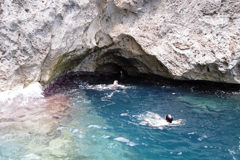 EAST/ADRIATIC side. The tour takes 1h 30min. It will depart from Santa Maria di Leuca and explore the coast for about 8 km, until locality "Ciolo". It is provided a swimming break of about 25 minutes. During the excursion you can admire the inlet "Ortocupo" and the cave "spray" or "puff", with its play of light. The cave "pit" or "lake", in which there is a lake brackish water colored blue fluorescent unique beauty