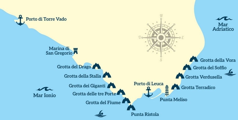 After visiting the last cave of the Ionic side, the trip reaches Punta Ristola from which we continue and we approach the port of Leuca to admire the marvelous villas and the monumental staircase that joins Leuca to Santa Maria di Leuca, where the sanctuary stands majestically.