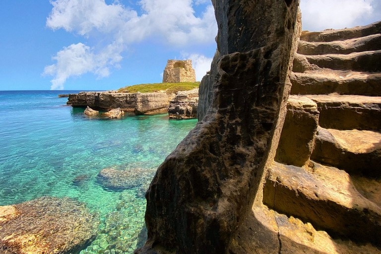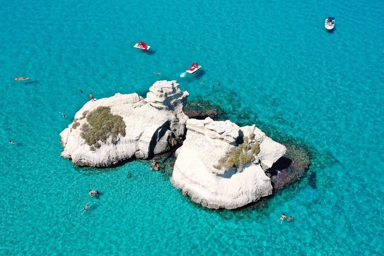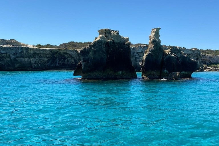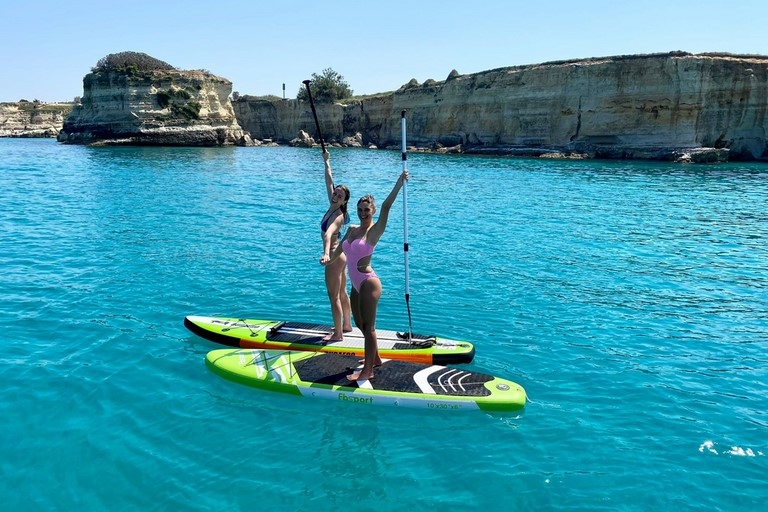 Escursione di mezza giornata a Torre dell'Orso con sosta bagno, aperitivo salentino a bordo (frisa), vino locale e frutta fresca. Con i sup e kayak a vostra completa disposizione potrete esplorare anche le baie di Roca vecchia.