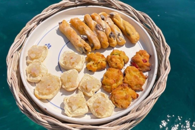 Per finire un aperitivo a bordo a base di prodotti tipici del posto,ovvero: mozzarelline fresche,prodotti da forno(pizzi e olivate), prosecco di Valdobbiadene,tè alla pesca e acqua.